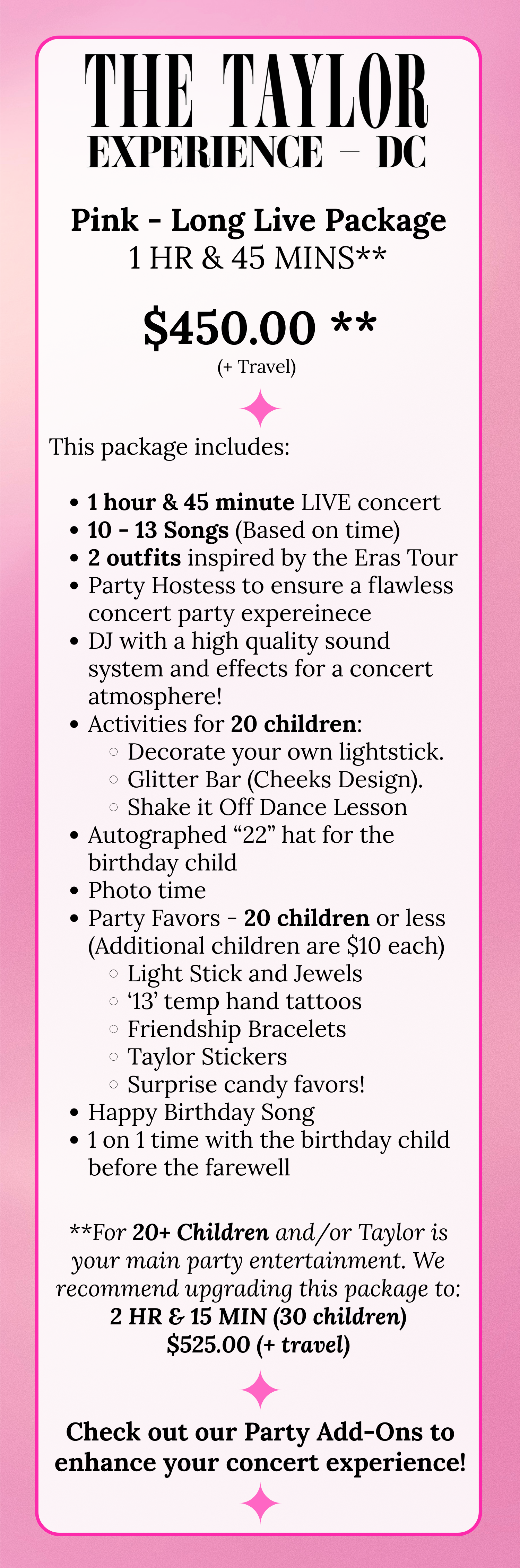 If your event includes more than 20 children and/or Taylor is your main party entertainment, we recommend the 2 hours & 15 minutes upgrade to the Long Live Package (up to 30 children) for $525 + travel.**