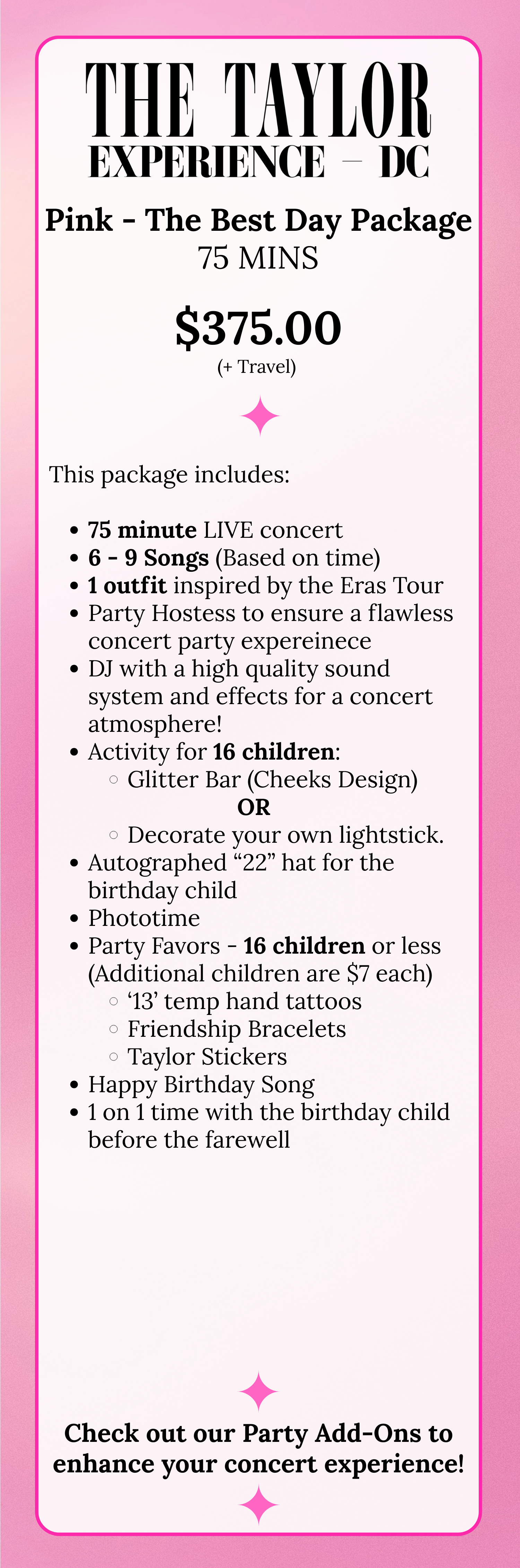 A non-stop, high-intensity concert experience made for ultimate Swifties who want to sing, dance, and live their pop-star dreams from start to finish. This package does not include a glitter or craft session. ✨🎤
